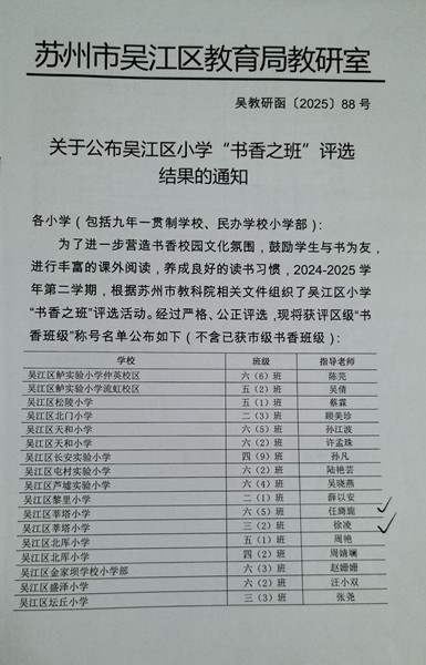 莘塔小学六5、三2被评为吴江区小学“书香之班”