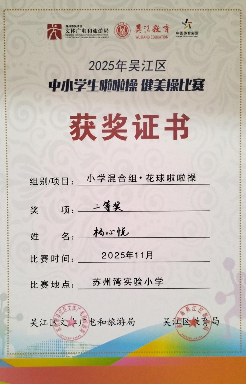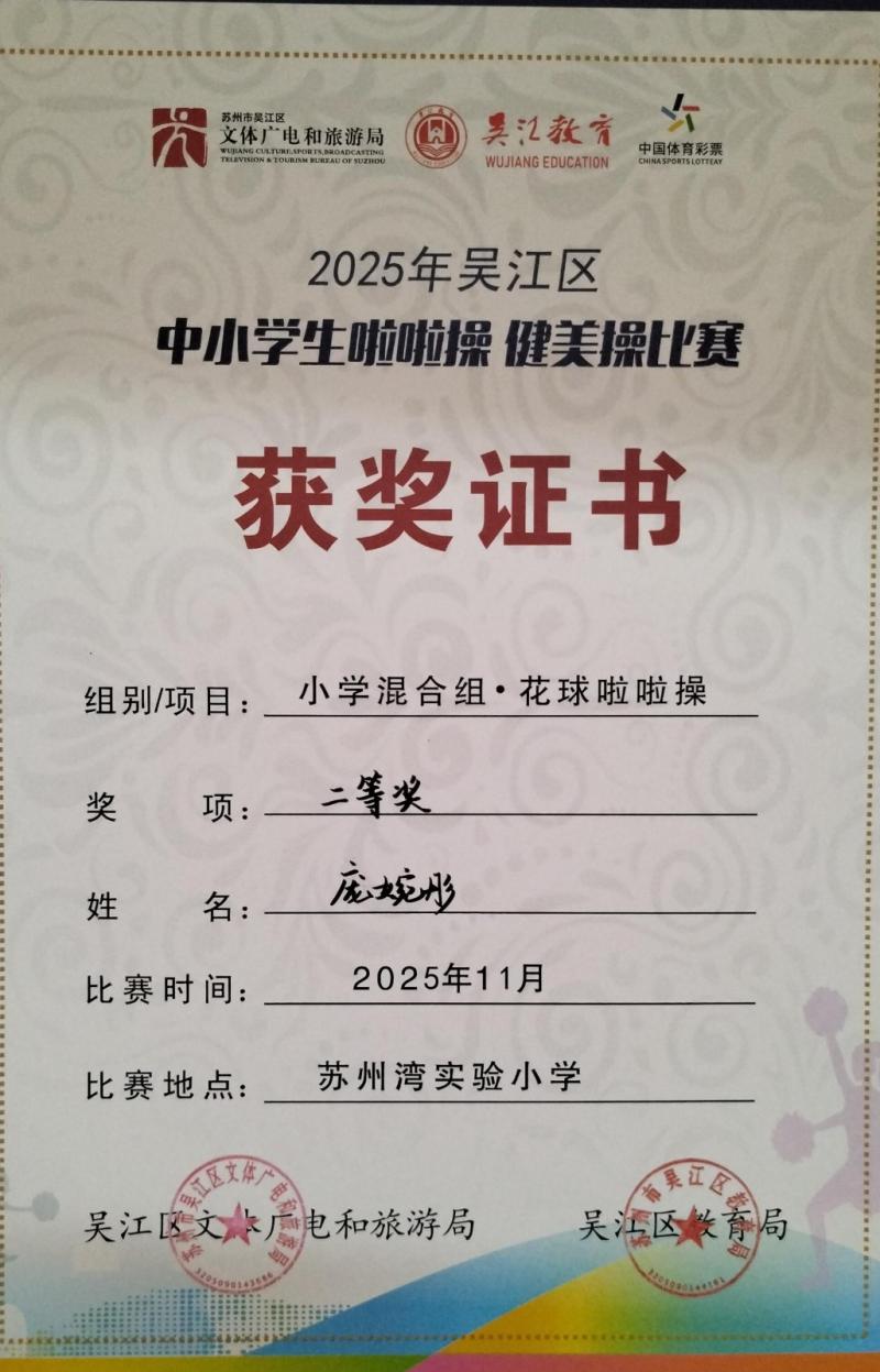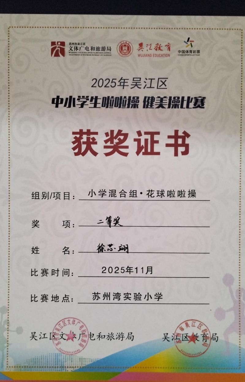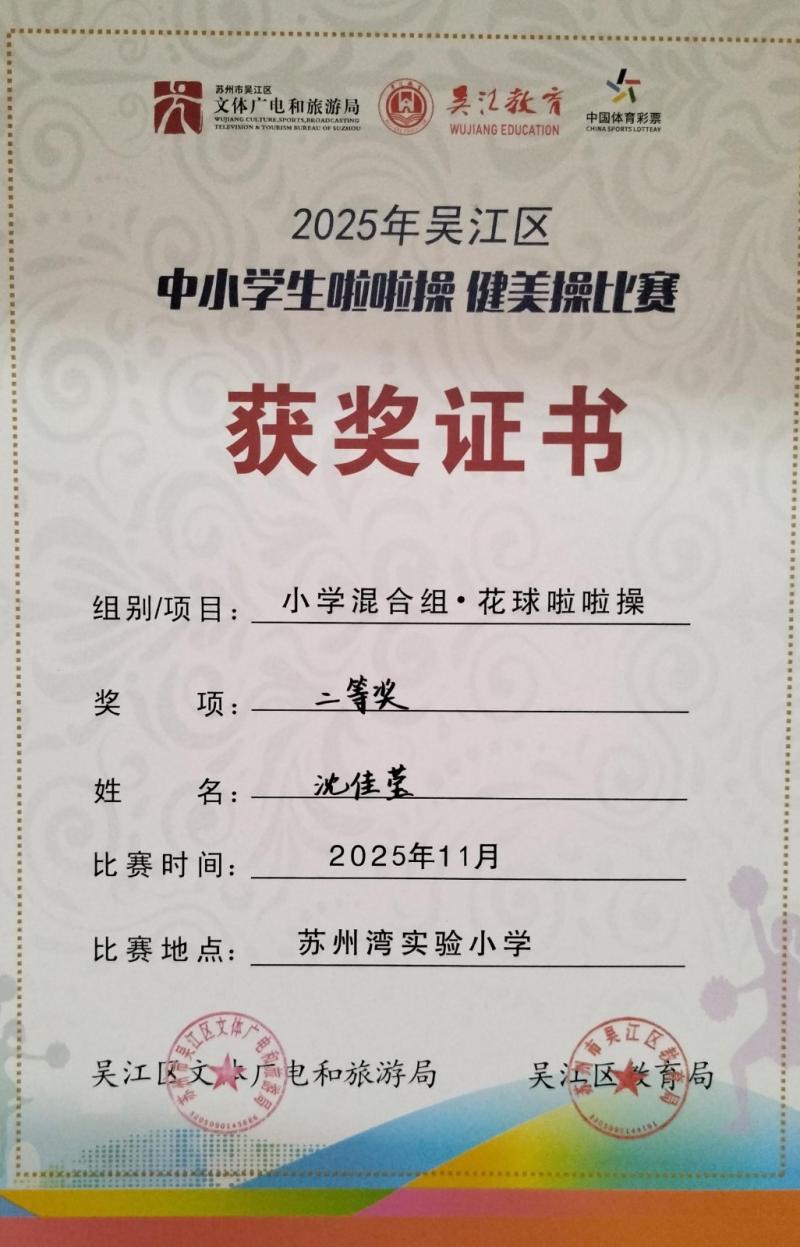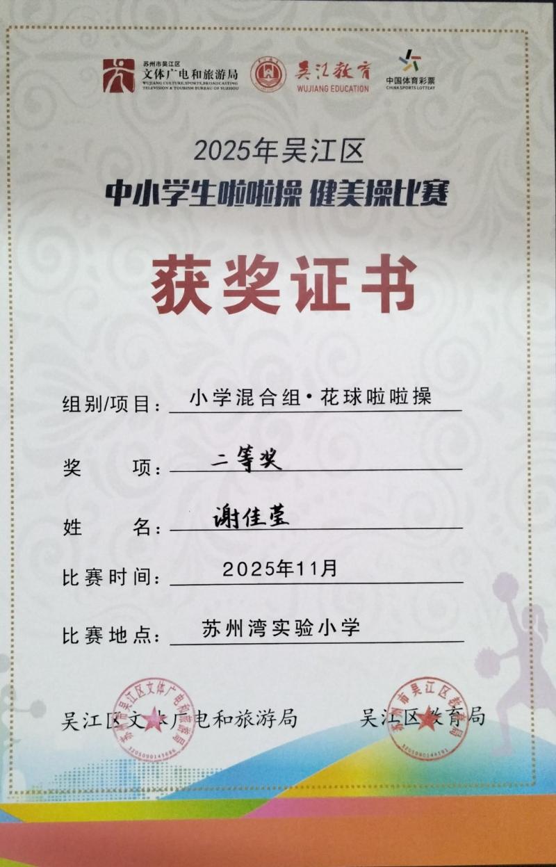莘塔小学在2025年吴江区中小学生啦啦操、健美操比赛中,荣获小学混合组 校园花球啦啦操二等奖