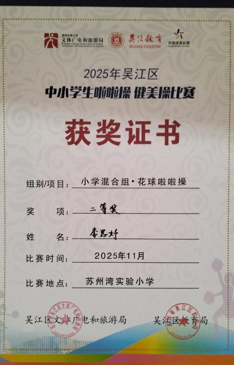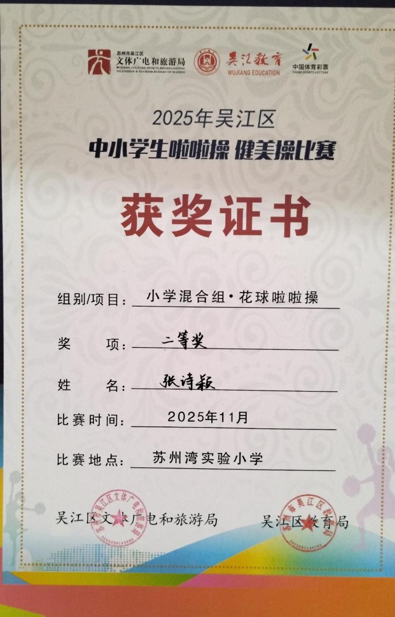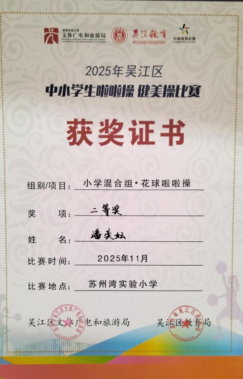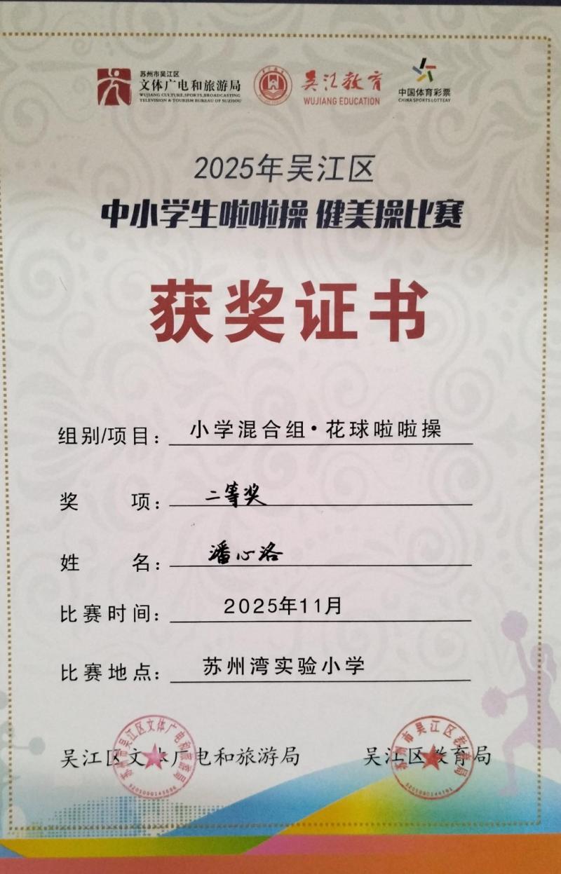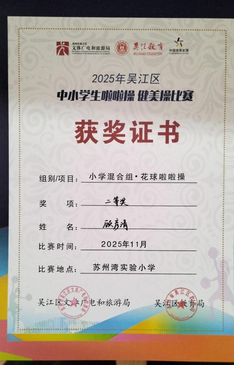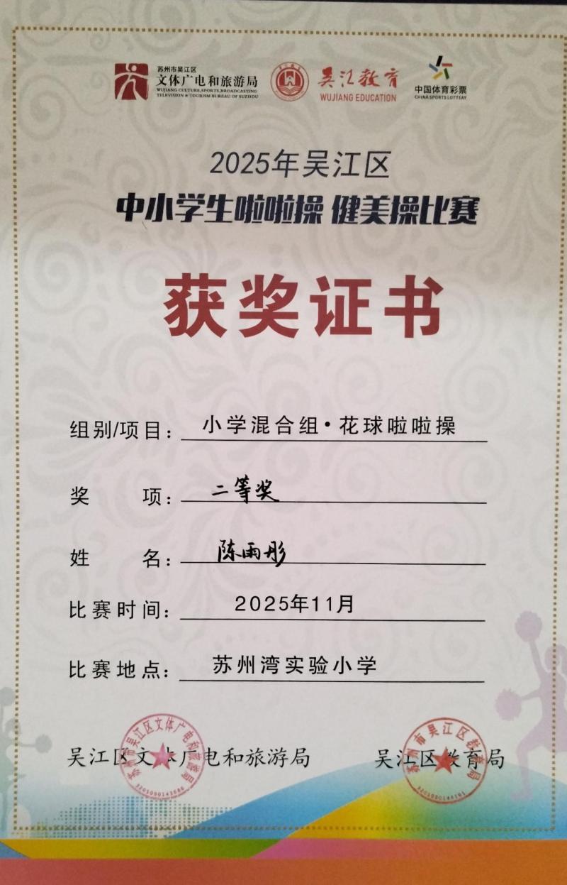 莘塔小学在2025年吴江区中小学生啦啦操、健美操比赛中,荣获小学混合组 校园花球啦啦操二等奖