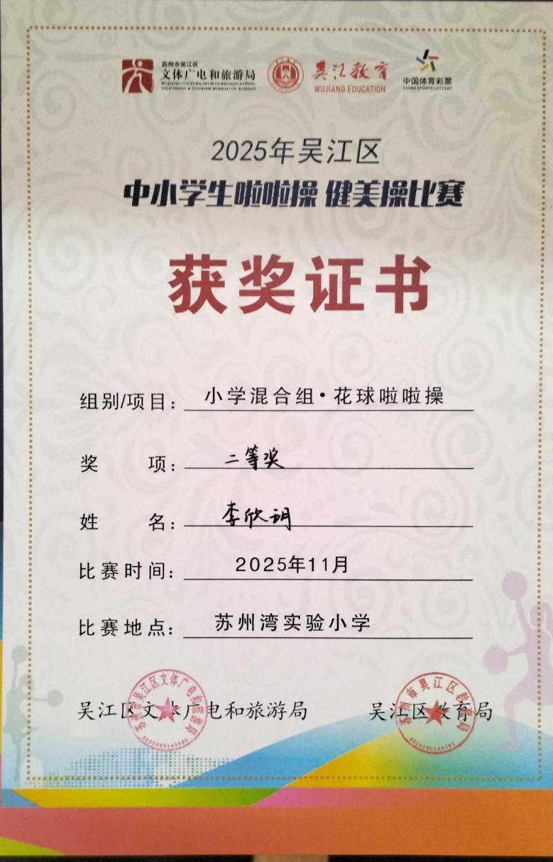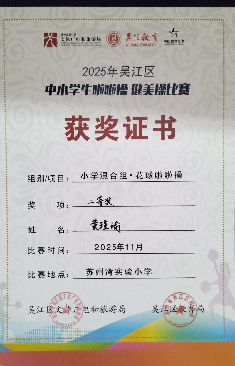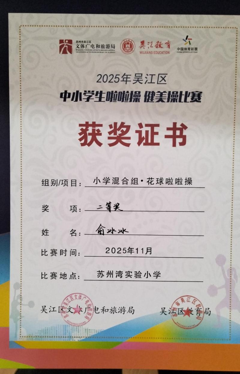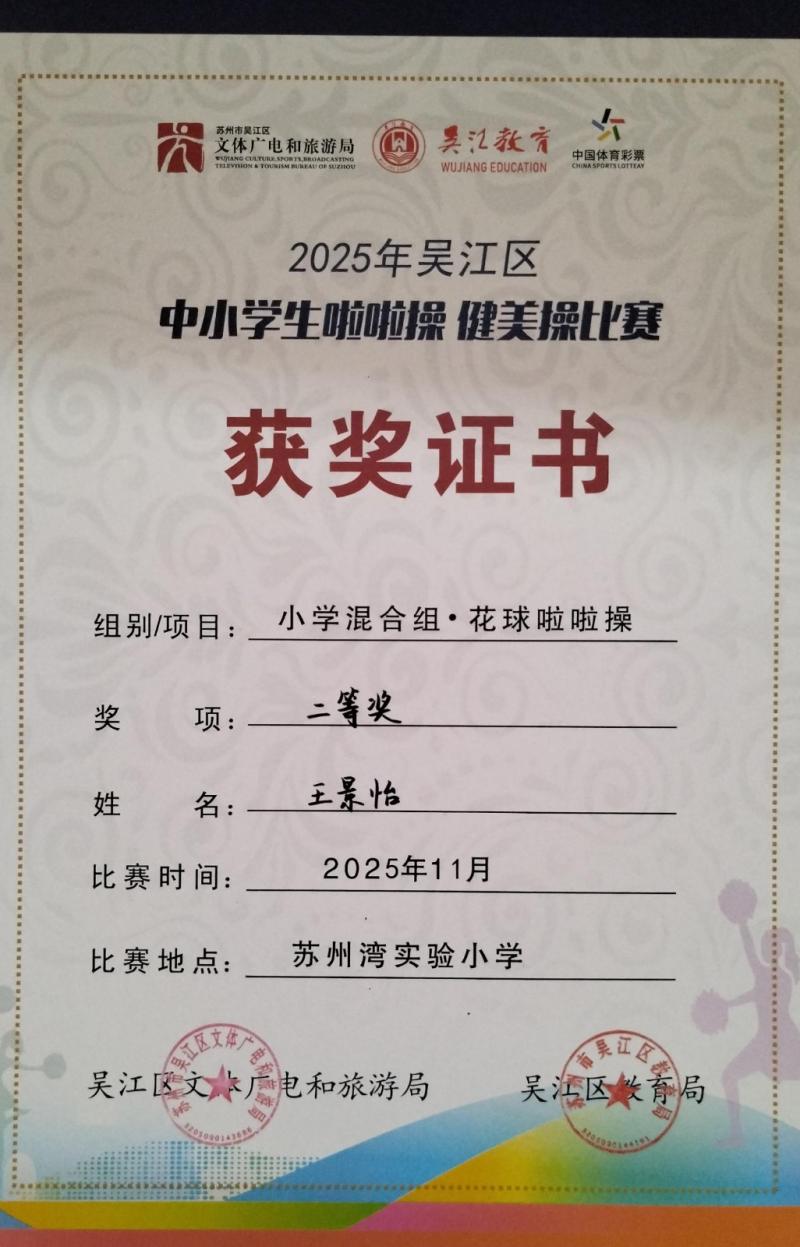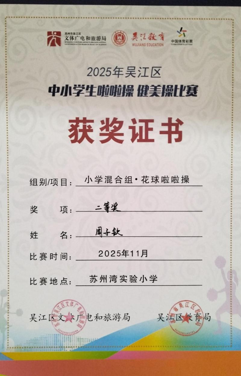 莘塔小学在2025年吴江区中小学生啦啦操、健美操比赛中,荣获小学混合组 校园花球啦啦操二等奖